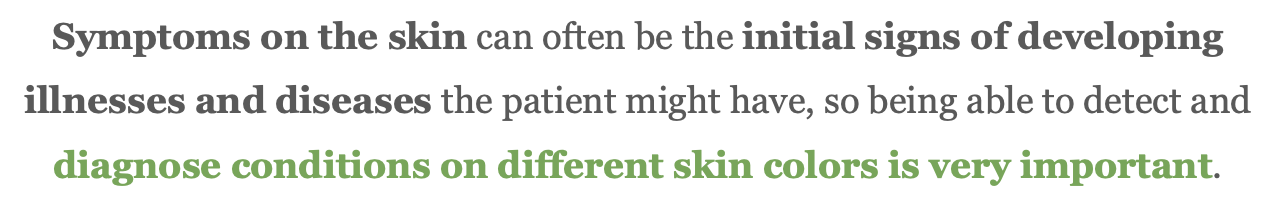 Images of conditions on dark skin are underrepresented in educational materials. This means that med school students, and future doctors, are trained to be biased towards white skin, and aren’t able to identify conditions on varying skin tones as easily.